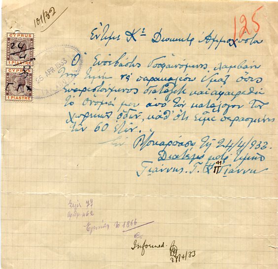Cyprus: 1933 petition franked with pair of 1pi KGV definitive abd tied by Commissioner Famagusta datestamp.