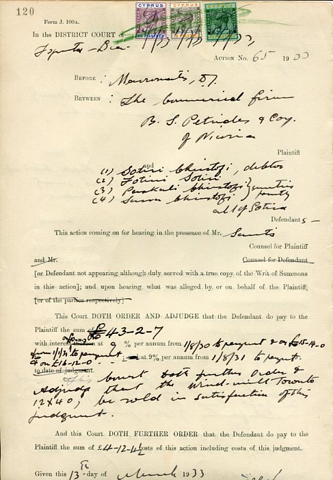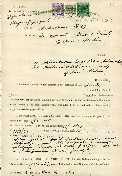 Cyprus: 1933 Famagusta District Court document franked with each side total of 2 x 4 1/2pi, 2 x 18pi and 2 x 45pi of 1924 KGV postage stamps and cancelled by green crayon. Komi Kebir, Sotira