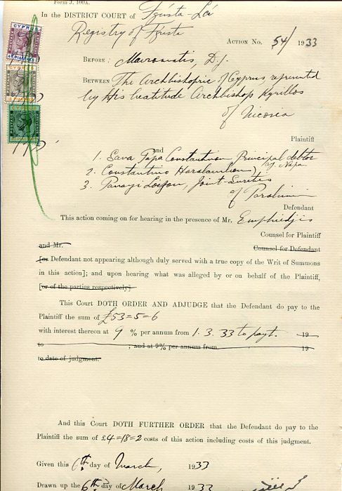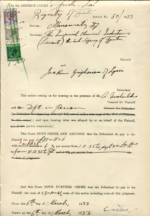 Cyprus: 1933 Famagusta District Court document franked with each side total of 2 x 4 1/2pi, 2 x 18pi and 2 x 45pi of 1924 KGV postage stamps and cancelled by green crayon. Lyssi, Paralimni, Nicosia