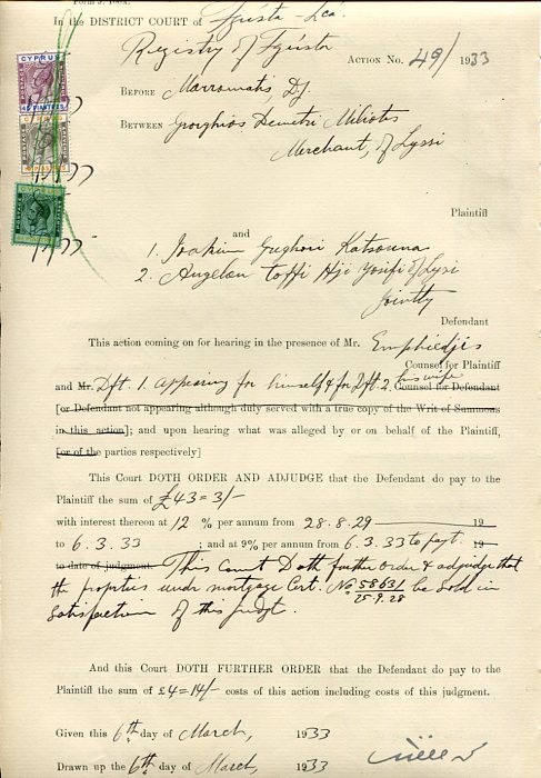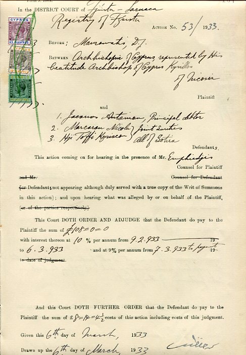 Cyprus: 1933 Famagusta District Court document franked with each side total of 2 x 4 1/2pi, 2 x 18pi and 2 x 45pi of 1924 KGV postage stamps and cancelled by green crayon. Nicosia, Sotira, Lyssi