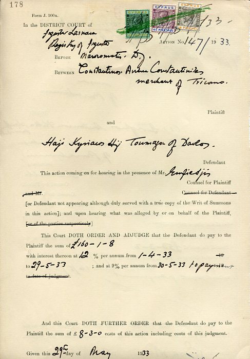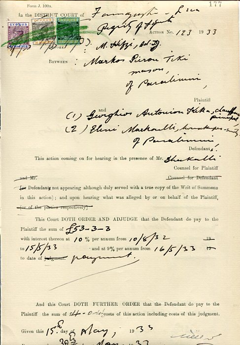 Cyprus: 1933 Famagusta District Court document franked with each side total of 2 x 4 1/2pi, 2 x 18pi and 2 x 45pi of 1924 KGV postage stamps and cancelled by green crayon. Paralimni, Tricomo, Davlos