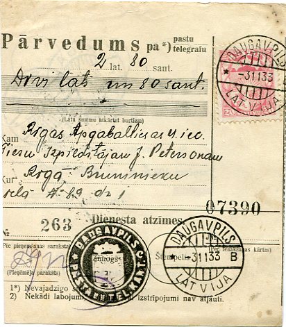 Latvia: 1933 (3 November). Postal order franked with 20s (type II) and tied by DAUGAVPILS datestamps and negative seal. Reverse next day Riga arrival cds’s. Sg. 139