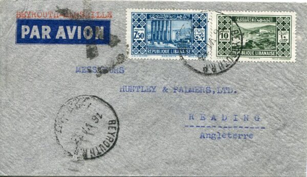 Lebanon: 1933 (6 June). Cover flown by Air Orient imprinted Maison P. Anghelopoulo to Reading, England franked with 7p50 and 10p pictorials tied by Beyrouth datestamps. Reverse 10 June Marseilles Gare Avion cds. Sg. 175a, 176