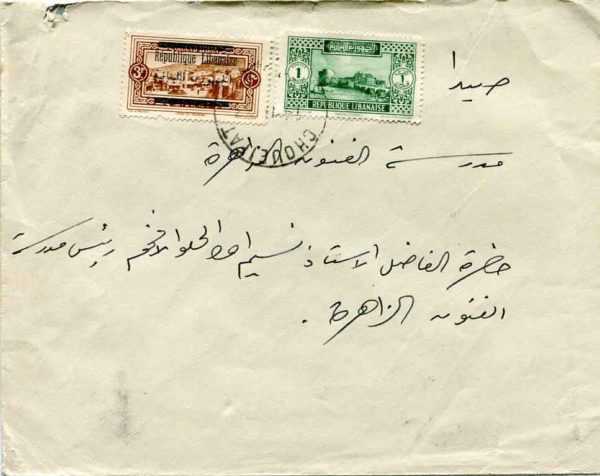 Lebanon: 1933 (11 November). Cover to Saida franked 1p and overprinted 3p pictorials and tied by CHOUEIFAT (longo type 4, rated 4/13) bilingual datestamp; on reverse 14 November Beirut transit and next day arrival cds’s.