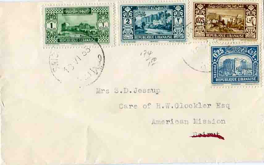 Lebanon: 1933 (13 June). Cover to American Mission at Beirut franked with pictorial stamps and tied by SAIDA – LIBAN (Longo type IV, 2 points) date stamps. Reverse part arrival cds.