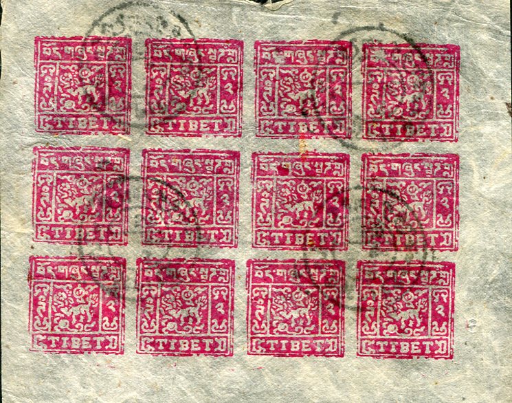 Tibet: 1933 type 2t. magenta imperforate sheetlet of 12 struck by four cancels. SOLD AS FORGERY