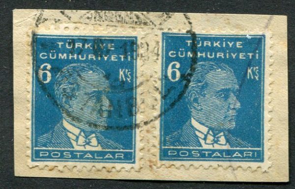 Turkey: 1933 second Ataturk definitive two 6k on piece one with POSTALAR instead of POSTALARI error. Isfila 1291