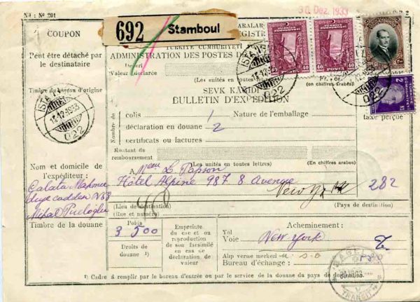 Turkey: 1933 (13 Dec) Registered parcel card to USA franked with pair of 40kl and 200k of 1926 issue and 2k Ataturk definitive, all tied by ISTANBUL O22 date stamps alongside Basel transit cds. Scarce usage of 200krs.