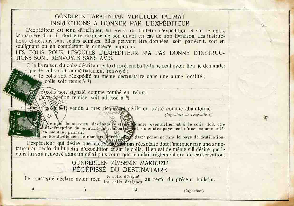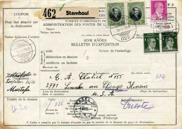 Turkey: 1933 (15 July) Registered parcel card to USA franked with pair of 100k of 1926 issue 30k and four 1k (two on reverse) Ataturk definitives, all tied by ISTANBUL O22 date stamps alongside Basel transit cds.