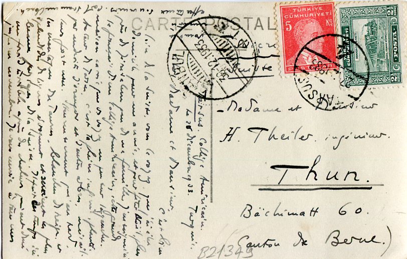 Turkey: 1933 (27 December). Photocard of Tarsus to Thun, Switzerland franked with 5k Ataturk definitive and 2 1/2k Ankara-Sivas Railway line stamps tied by Tarsus datestamp and 30 December Istanbul transit cds.