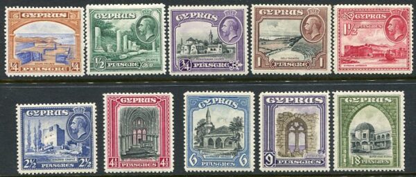 Cyprus: 1934 (1 December). KGVI pictorial issue mint o.g. values to 18pi. Sg. 133/142. *