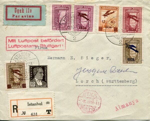 Türkiye: 1934 (2 October). Registered airmail cover to Germany franked with complete set of 1934 surcharged airmail set, 40k pictorial and 10k Atatürk definitive stamps totalling 1l.55k. tied by Istanbul datestamps, same day red octagonal airmail dispatch and rectangular by Stuttgart airmail service hand cachet. Reverse 4 October München transit and same day Lorch arrival cds’s.
