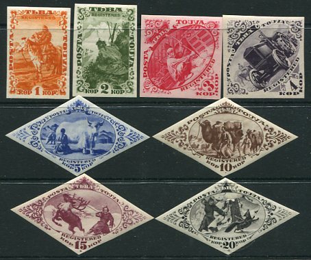 Tannu Tuva: 1934 new currency Registered inscribed pictorial issue imperf. mint o.g. set. Sg. 43/50