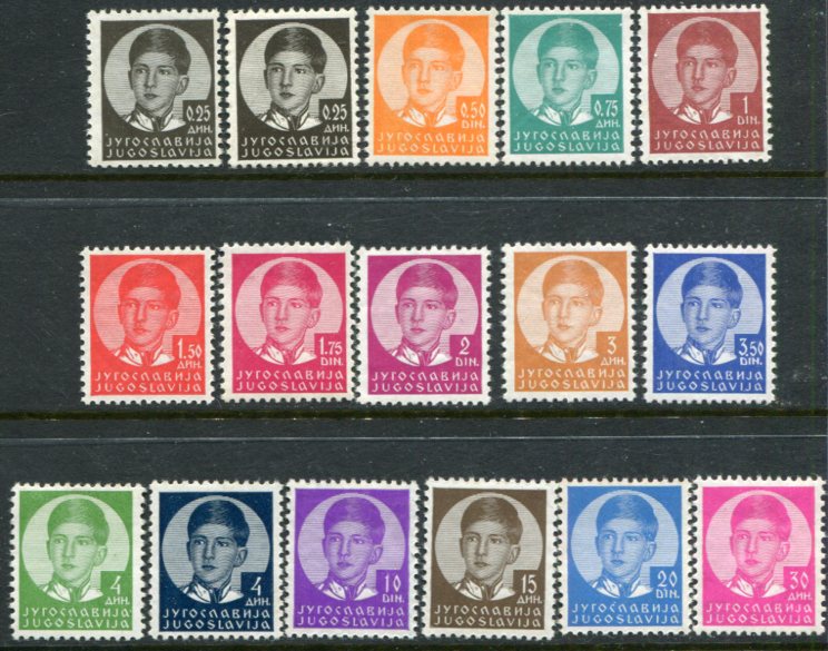 Yugoslavia: 1935-36 young King Peter II portrait unmounted mint set inc. 25p thick paper. Mi. 300x&y/314, Sg. 320/333, 320a. **