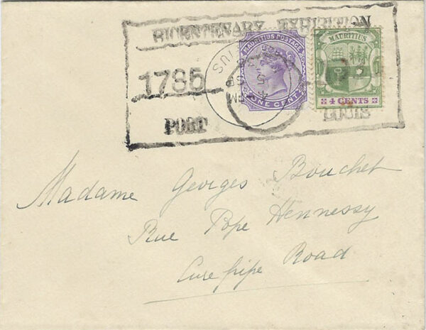 Mauritius: 1935 (5 Sep) cover Port Louis to Curepipe with stamps tied by large BICENTENARY EXHIBITION framed date stamp, Port Louis cds within the frame, further Port Louis different cds on reverse, square Curepipe Delivery cancel and an arrival cds both of 6th.
