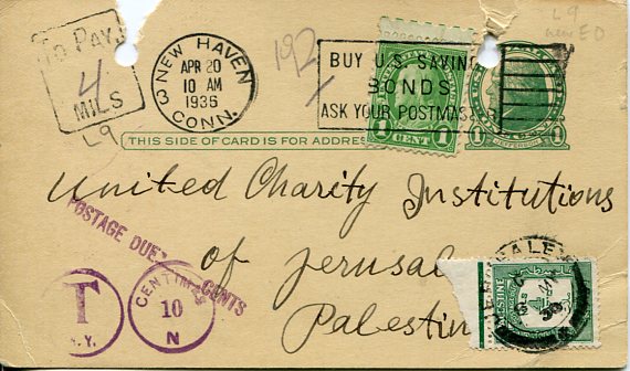 Palestine: 1935 (20 April). Uprated 1c postal stationery card from New Haven, United States to Jerusalem struck on arrival black TO PAY 4 MILS handstamp and franked with 4m postage due stamp tied by 8 March arrival cds. Couple of archival puncholes.