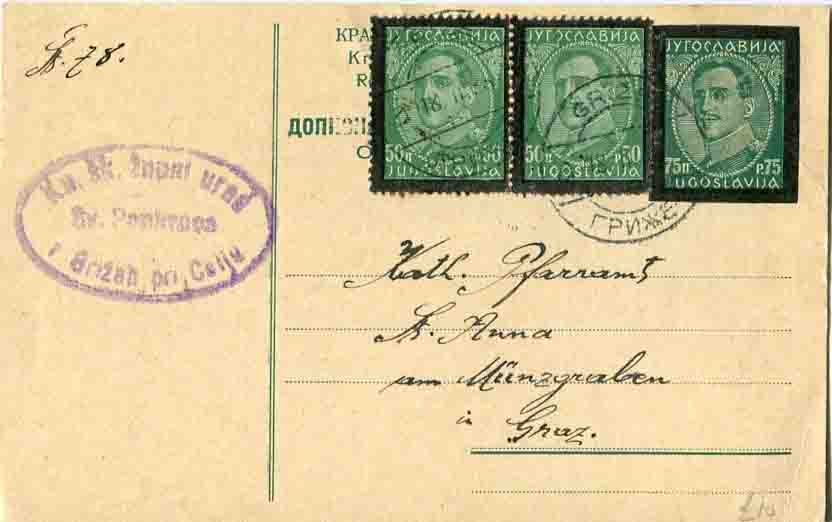 Yugoslavia: 1935 (18 November). Postal card to Austria franked with pair of 50p and 75p of King Alexander Mourning stamps and tied by GRIZE (Slovenia) date stamps.