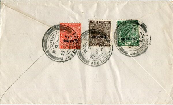 India: 1936 (23 September). Cover from British Consulate General to United States franked on reverse with 1/2a., 1a. and 2a. SERVICE overprinted official stamp tied by Pondicherry datestamp.
