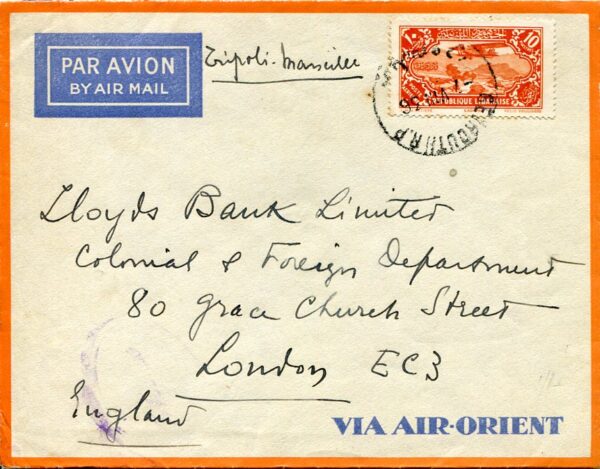 Lebanon: 1936 (7 August). Cover by Air France to London franked with 10p (Kadicha 5mm long) airmail and on reverse 7p50 pictorial stamps tied by Beyrouth datestamps and 11 August Foreign Deparmant date cachet. Sg. 175a, 186a