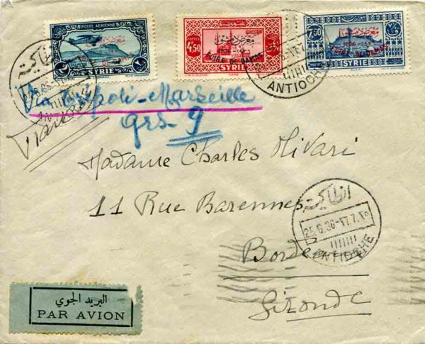 Syria: 1936 (25 June). Airmail cover to France with blue manuscript ‘via Tripoli – Marseille’ franked with 4p50 and 7p50 postage and 2p Airmail stamps overprinted 1936 FOIRE DE DAMAS for Damascus Fair tied by ANTIOCHE (now Antakya, Turkey) datestamps. Reverse 26 June Tripoli, Lebanon transit and 28 June Marseille – Gare and next day Bordeaux arrival cds’s. SG 305, 307, 311