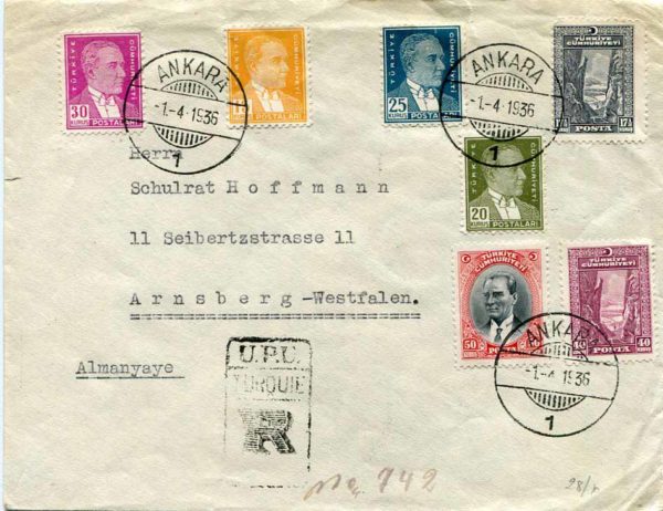 Turkey: 1936 (1 April). Registered overfranked cover to Germany with Ataturk definitives, pictorials and 50k of 1930 high value stamp tied by Ankara 1 datestamp. Reverse 5 April Arnsberg arrival cds and typed declaration in Turkish says ‘additional stamps franked by the sender’ as required for overfranked mail.
