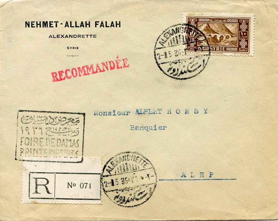Syria: 1936 (4 May). Commercial registered cover to Alep franked with 10pi pictorial stamp and tied by ALEXANDRETTE (today Iskenderun, Turkey) datestamps, registration label and 1936 Damas Fair commemorative handstamp. Reverse same day arrival cds.