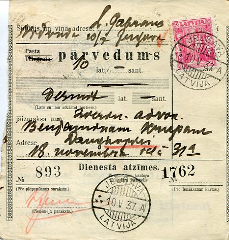 Latvia: 1937 (10 May). Postal order franked with 20s (type I) tied by JELGAVA datestamps. Reverse 11 May Riga and Posta Tekosu * Rekinu Dala arrival cds’s. Sg. 138
