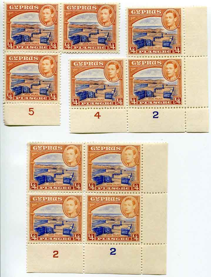 Cyprus: 1938 KGVI pictorials 1/4pi unmounted mint plate 2/2, 2/4 and 5 blocks of 4 or 3. Sg 151