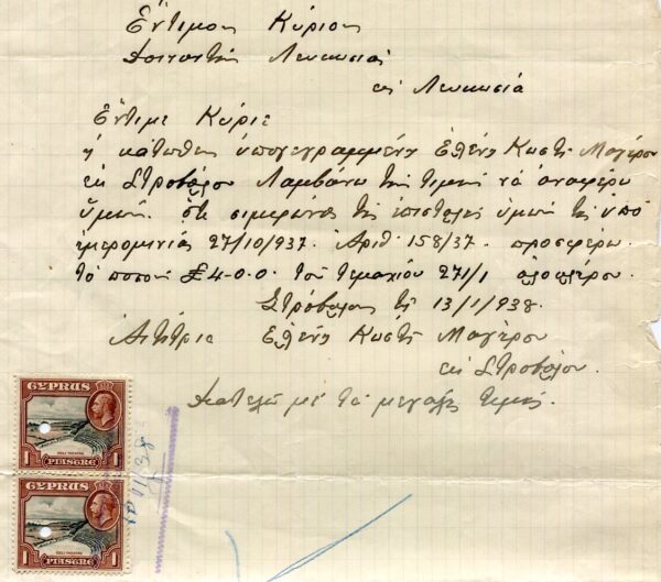 Cyprus Rizokarpasso 1936 Mukhtar Seal