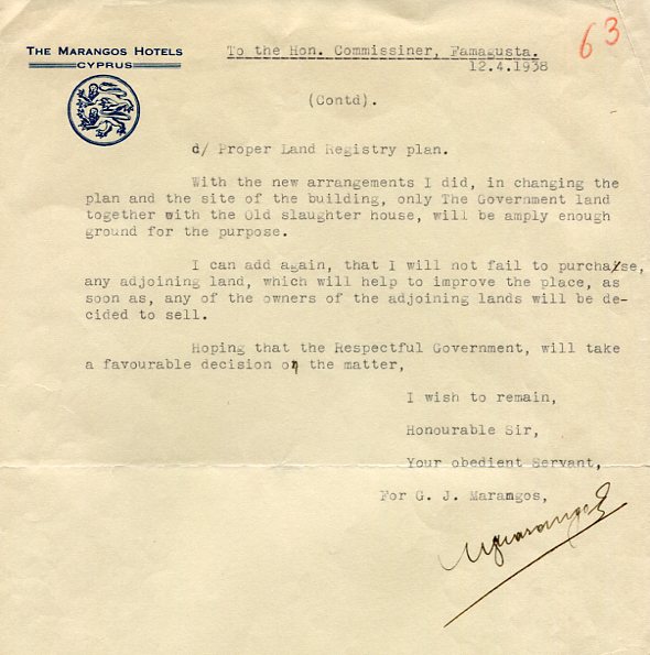 Cyprus: 1938 letter to the Commissioner from MARANGOS HOTEL Famagusta