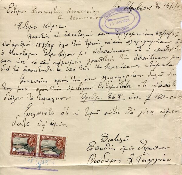 Cyprus: 1938 petition franked with pair of 1pi of KGV with Nicosia Commissioner date cachet