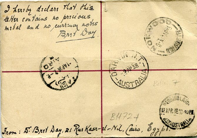 Egypt: 1938 (1 April). 15m plum Survey print registered postal stationery envelope to Adelaide, South Australia uprated with two 50m King Fuad I and 20m young King Farouk stamps tied by CITADEL CAIRO datestamps and on reverse same day Cairo, 6 April Norwood, 9 April Darwin and 12 April arrival cds’s. Balian 7