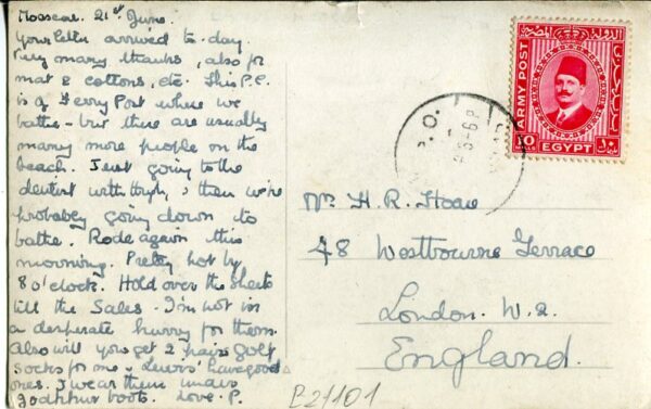 Egypt: 1938 (21 June). Photocard of Moascar Beach to England franked with 10m Army Post stamp and tied by A.P.O. MOASCAR datestamp.
