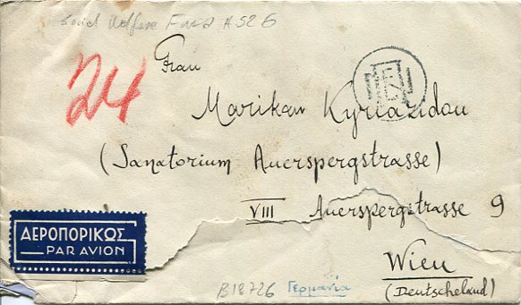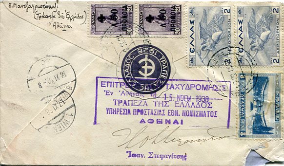 Greece: 1938 (15 November). Bank of Greece cover to Austria franked with various commemoratives and pair of 50l on 20l Social Welfare Fund stamps tied by Athens datestamp, 17 & 18 November Vienna arrival cds’s and violet boxed bank’s handcachet and label. Large tear on front otherwise scarce. Hellas C79.