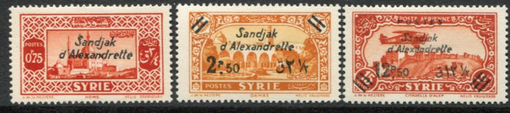 Hatay – Alexandrette: 1938 (2 September). Sandjak Alexandrette overprinted and surcharged on Syrian stamps mint o.g. set. Sg. 9/12, Isfila H24/26. *