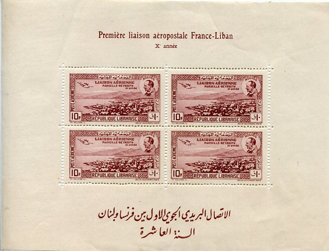 Lebanon: 1938 (15 July). Tenth Anniversary of First Air Service between France an Lebanon perforated unmounted mint miniature sheet. Sg. MS242a. **