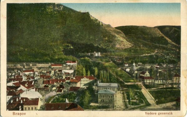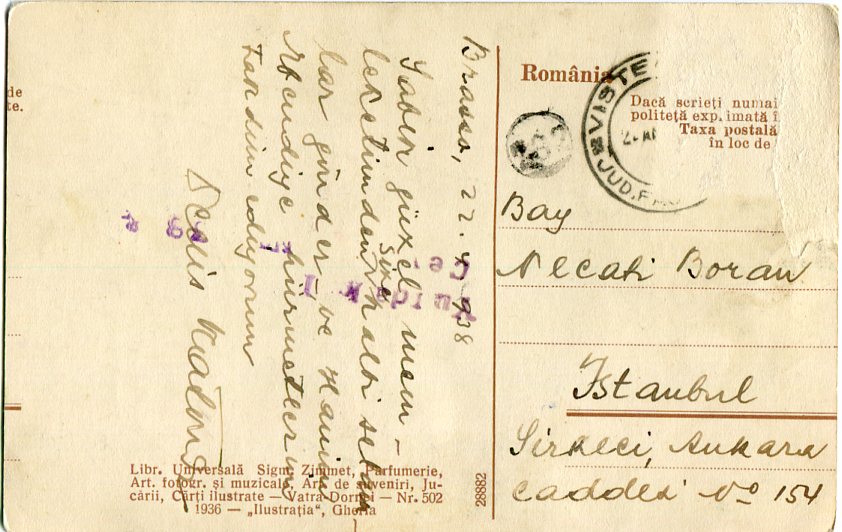 Romania: 1938 (22 April). Postcard to Istanbul written in Turkish titled ‘Brasov vedere generale’. Stamp fallen with part Vistea datestamp.