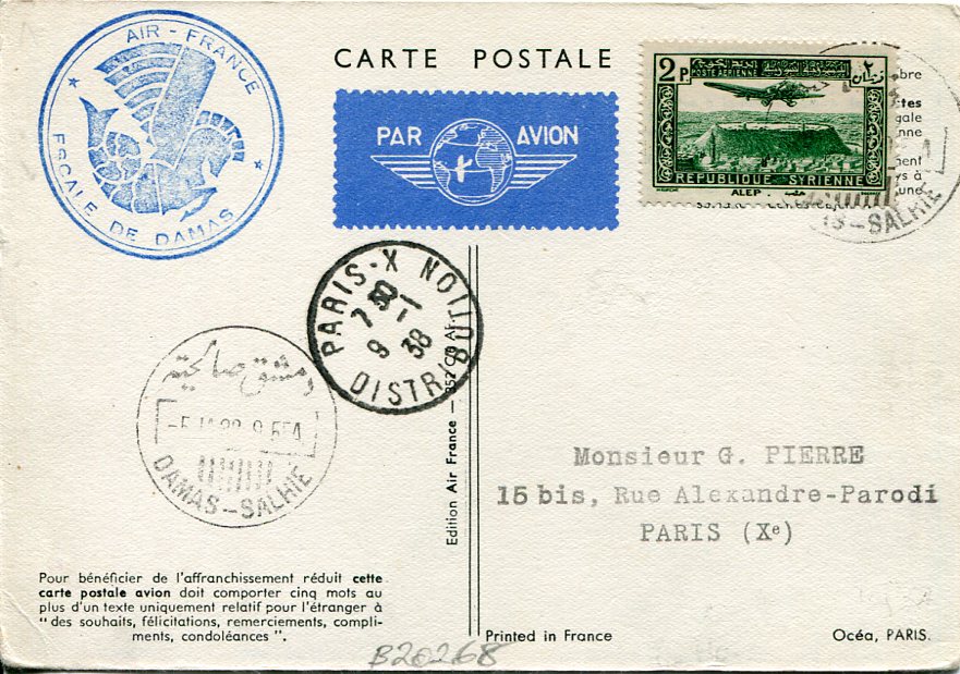 Syria: 1938 (5 January). Air France publicity postcard imprinted ‘Escale de Damas’ (Damascus Stopover) to France franked with 2p airmail stamp for reduced Christmas rate for the period between 1 December and 15 January tied by Damas – Salhie datestamp and 9 January Paris arrival cds. Sg. 324
