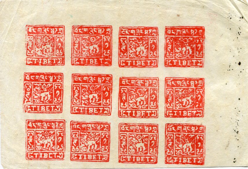 Tibet: 1938 type 1t. scarlet unused imperforate sheetlet of 12 (*). SOLD AS FORGERY