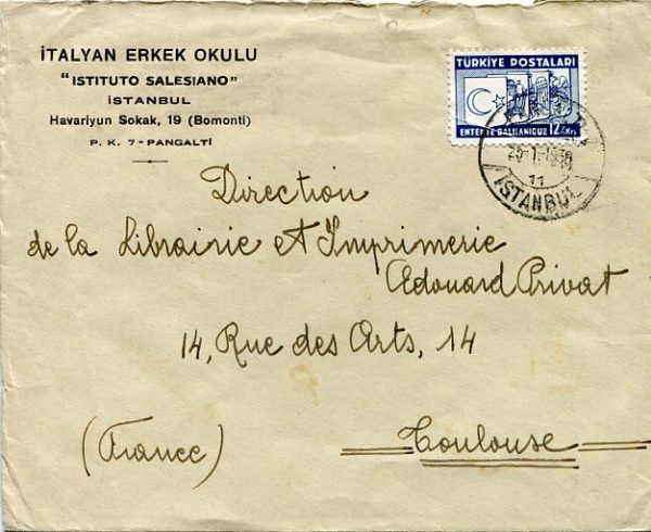 Turkey: 1938 (25 January). Italyan Erkek Okulu (Italian Boys School) imprinted cover to Toulouse, France franked with 12 1/2k Balkan Entente commemorative stamp and tied by Pangalti – Istanbul datestamp.