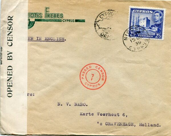 Cyprus: 1939 (15 December). Lyssiotis Freres imprinted cover to Gravenhage, Netherlands franked with 2 1/2pi of KGI stamp tied by Nicosia datestamp, red PASSED CENSOR 7 and ‘Cyprus Oranges’ slogan hand cachets.