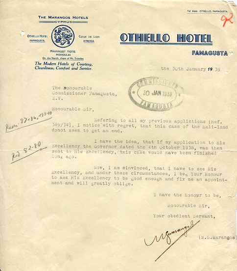 Cyprus: 1939 letter to the Commissioner from OTHELLO HOTEL Famagusta of The Marangos Hotels