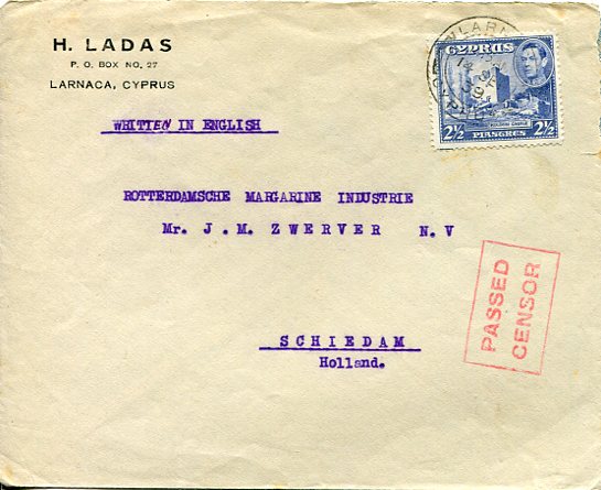Cyprus: 1939 (14 September). Cover imprinted H. Ladas to Netherlands franked with 2 1/2pi of KGVI pictorial tied by Larnaca datestamp. Reverse blank. Early censorded cover.