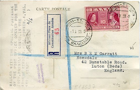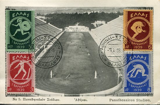 Greece: 1939 (1 October). Registered Panathenaic Stadium postcard franked with set of 10th Balkan Games and on reverse 10l Queens issue to England tied by first day Stadium commemorative cancellations. Scarce maxicard. Sg. 528/531