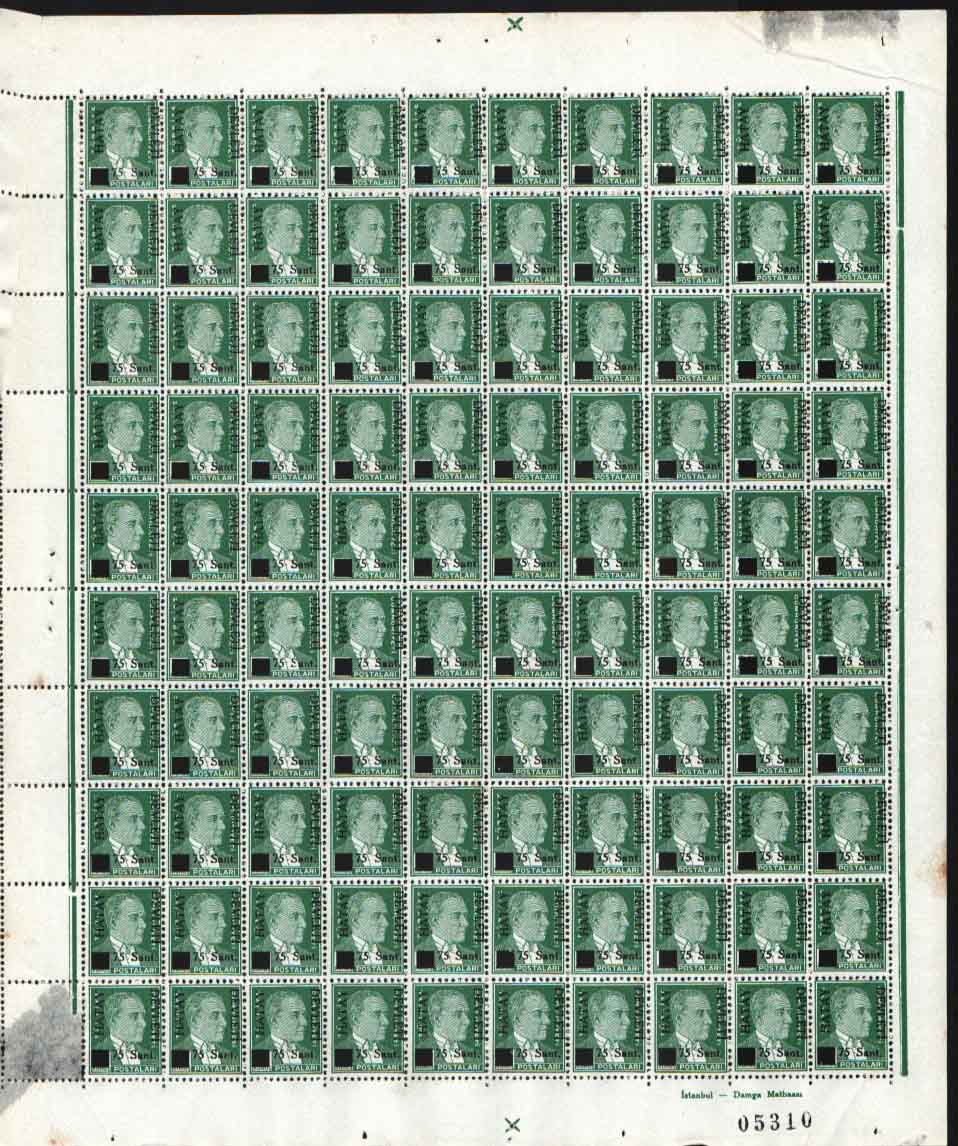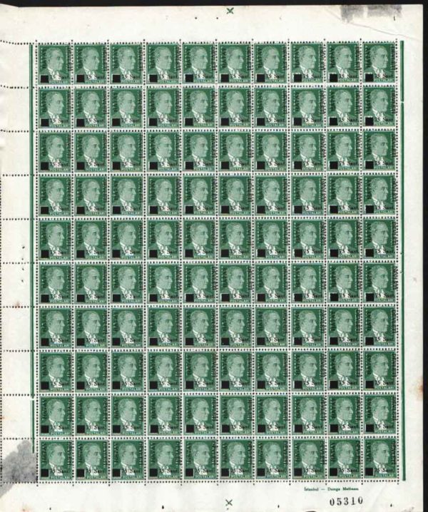 Hatay: 1939 (25 January). Hatay Devleti 75 Sant surcharged on 2 1/2k deep green Ataturk definitive stamps of Turkey unmounted mint complete sheet of 100. Some imperfections and rust spots. Please note sheet numbers may vary. Isfila H35