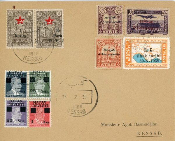 Alexandrette – Hatay Republic: 1939 (17 July). Armenian stamp dealer Agop Basmadjian cover franked with four Atatürk definitive, Map of Hatay and three Sandjak Alexandrette overprinted Syrian stamps and two Ottoman Child Welfare charity stamps tied by Kessab datestamps.
