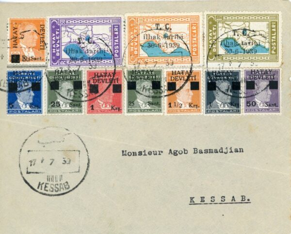 Hatay Republic: 1939 (17 July). Philatelic cover franked with set of overprinted Atatürk portrait and Map of Hatay stamps tied by Kessab datestamps.