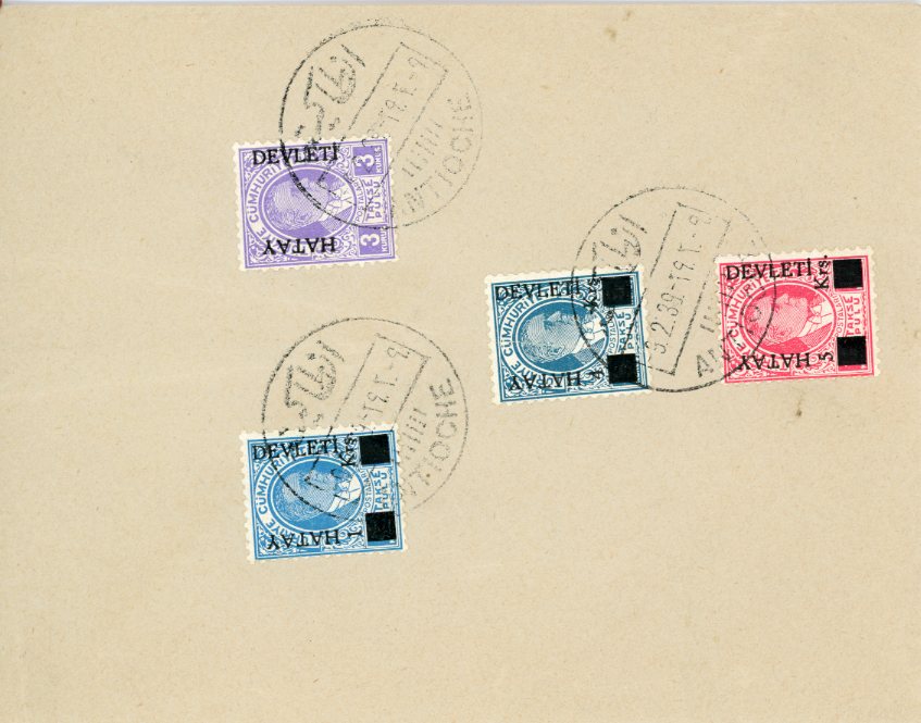 Hatay Republic: 1939 (9 February). Philatelic cover franked with set of overprinted Atatürk portrait postage due stamps tied by Antakya – Antioche datestamps.