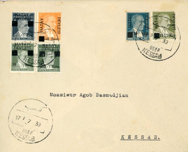 Hatay Republic: 1939 (17 July). Philatelic cover franked with overprinted Atatürk portrait stamps tied by Kessab datestamps.