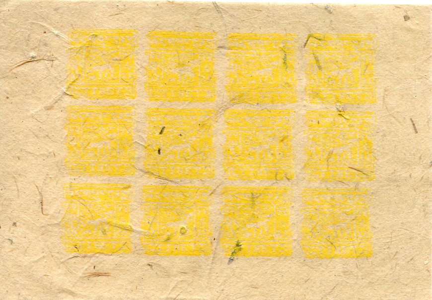 Tibet: 1940 type 1/2t. yellow-ochre unused imperforate sheetlet of 12 (*). SOLD AS FORGERY